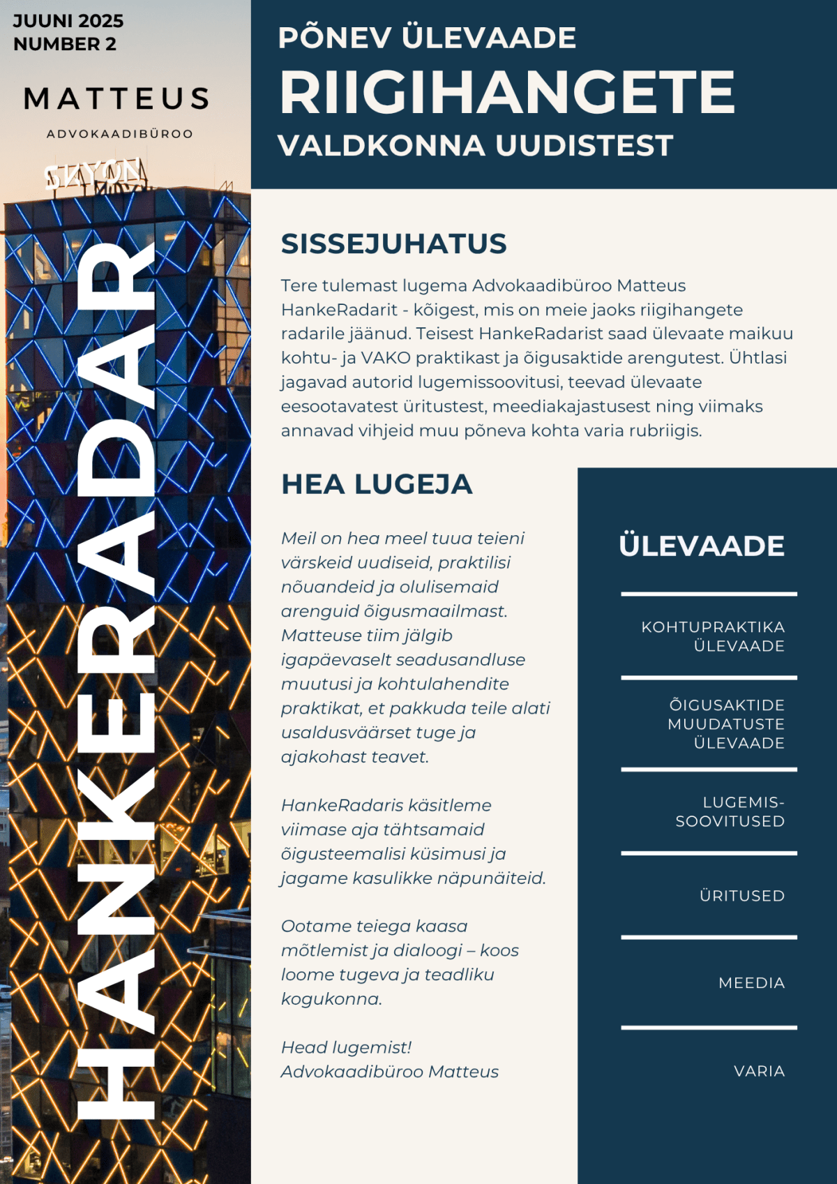 Meil on hea meel tutvustada HankeRadarit – Advokaadibüroo Matteuse igakuist tasulist uudiskirja vormis teenust, mis hoiab sind kursis kõige olulisemaga riigihangete maailmas. Igas väljaandes toome sinuni:
